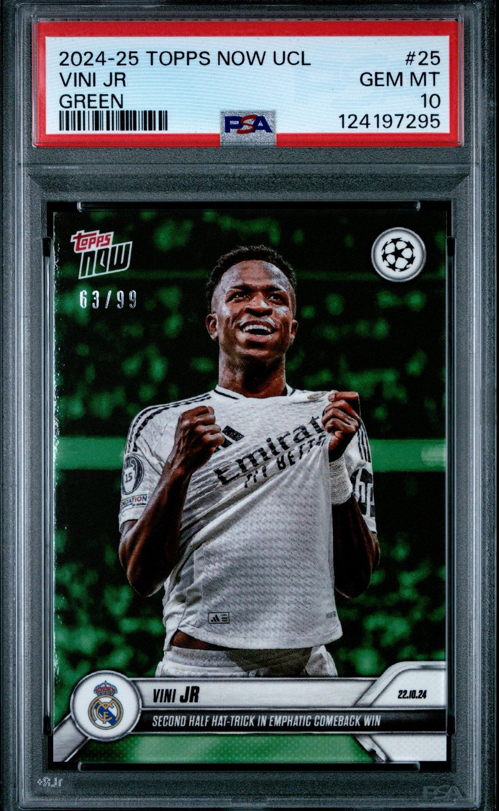 This PSA 10 Topps NOW® Green parallel showcases Vini Jr’s explosive second-half hat-trick that powered his team to a memorable comeback victory. Graded in gem mint condition, the card features pristine surfaces, razor-sharp corners, and perfect centering. A standout collectible that captures one of Vini Jr’s most electrifying performances of the season.
