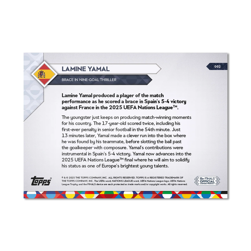 This PSA 9 graded card showcases rising superstar Lamine Yamal during the 2025 UEFA Nations League, capturing a key moment early in his international career. With strong visual appeal, excellent surface quality, and sharp overall presentation, this near-mint card offers collectors a high-grade, highly desirable piece of one of football’s most promising young talents. A standout addition for any collection focused on future icons of the sport. Trading cards come in plastic cases.