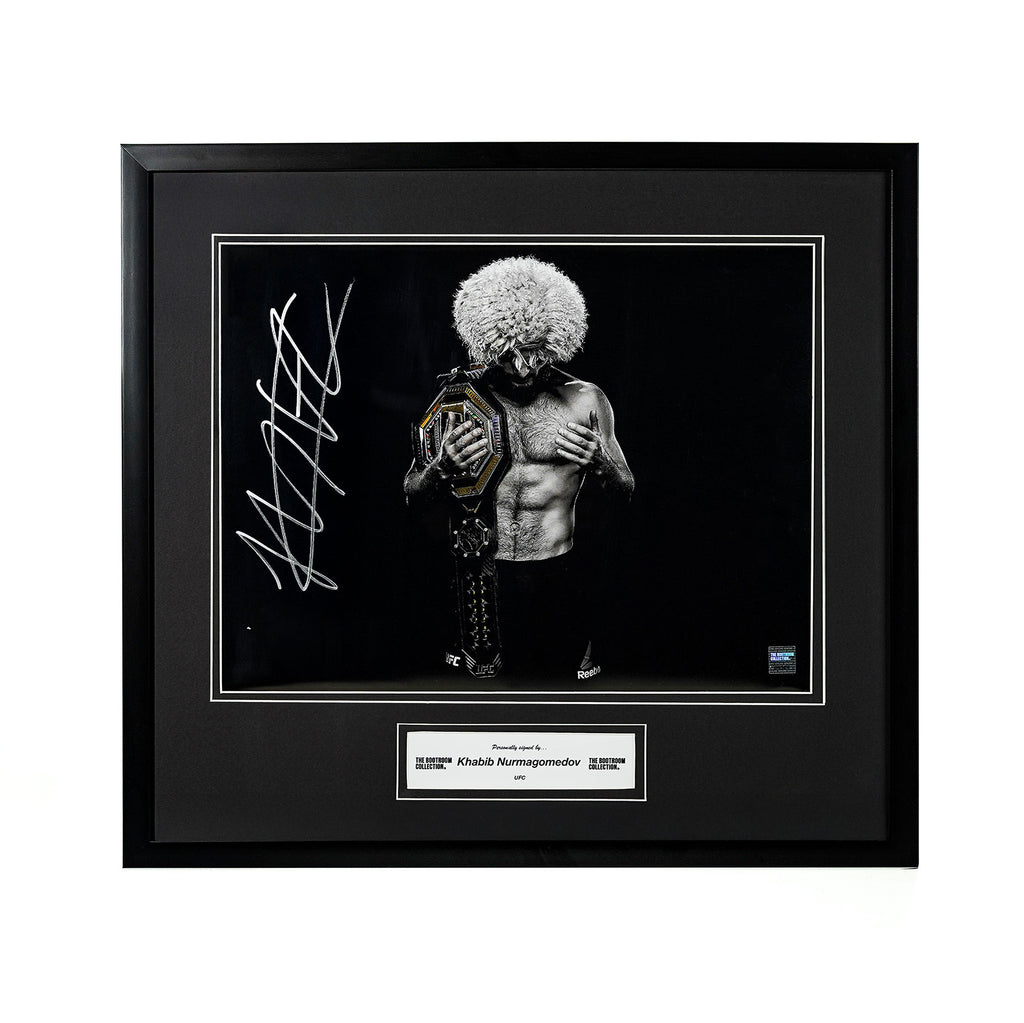 This striking framed display features an authentic signed portrait of Khabib Nurmagomedov, captured in a powerful and artistic moment holding the UFC Championship belt. Presented in dramatic black-and-white styling, the image highlights Khabib’s dominance, composure, and legacy as one of the greatest fighters in mixed martial arts history.