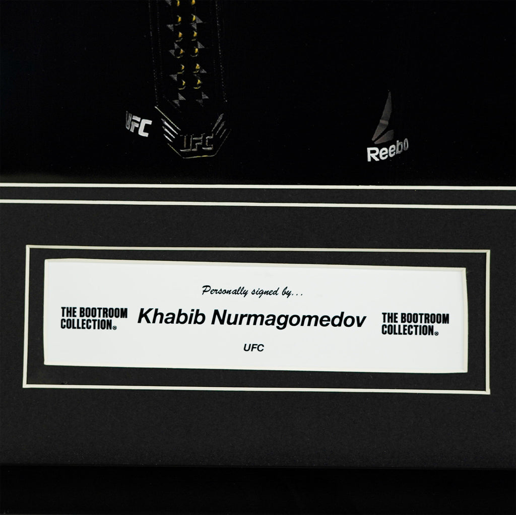 The autograph is prominently displayed in silver ink, standing out boldly against the dark background. Professionally framed and finished with an engraved nameplate, this piece is designed for immediate display and long-term preservation. The imagery reflects Khabib’s undefeated reign and his status as a true icon of the UFC.