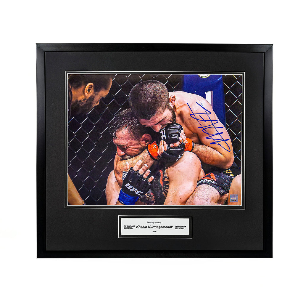 The image has been hand-signed by Khabib Nurmagomedov, with the autograph clearly displayed on the photograph. Professionally framed in a sleek black frame with a clean double mount, this piece is presentation-ready and designed to stand out in any premium MMA or UFC memorabilia collection.