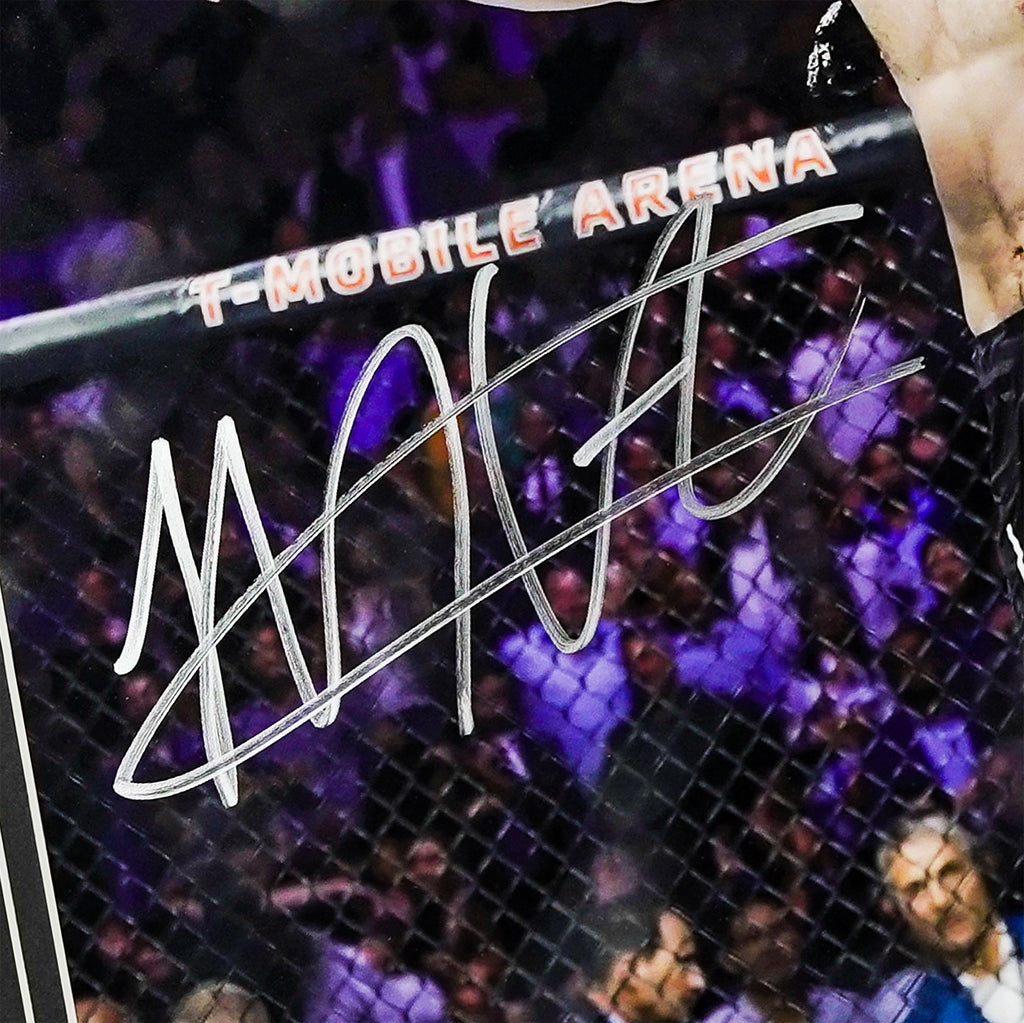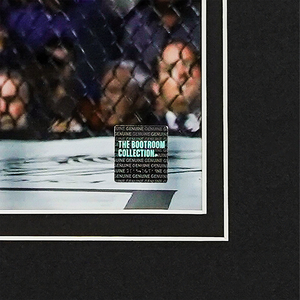 The autograph is boldly applied to the photograph and presented in a high-quality professional frame with an engraved nameplate, creating a striking and display-ready piece. A true collector’s item, this piece celebrates the legacy of one of the greatest fighters in mixed martial arts history, renowned for his perfect professional record and relentless dominance.