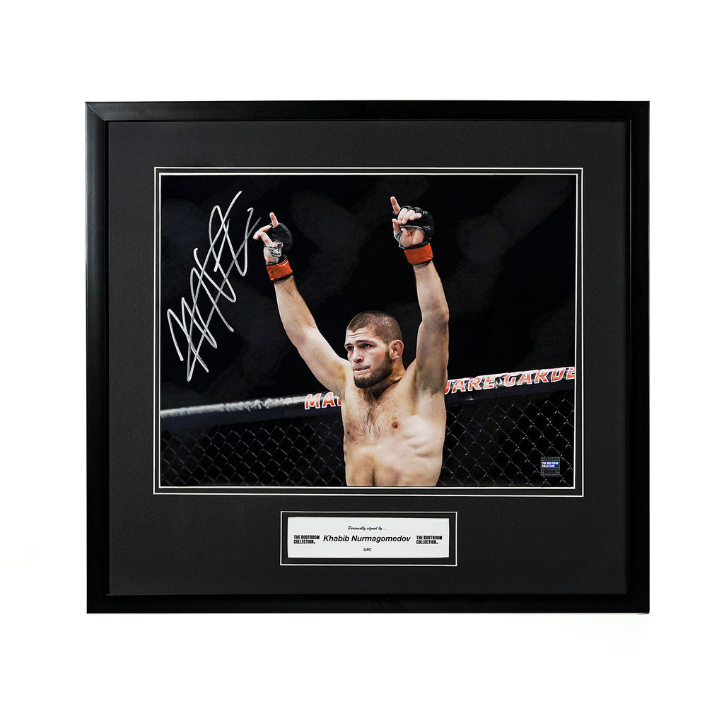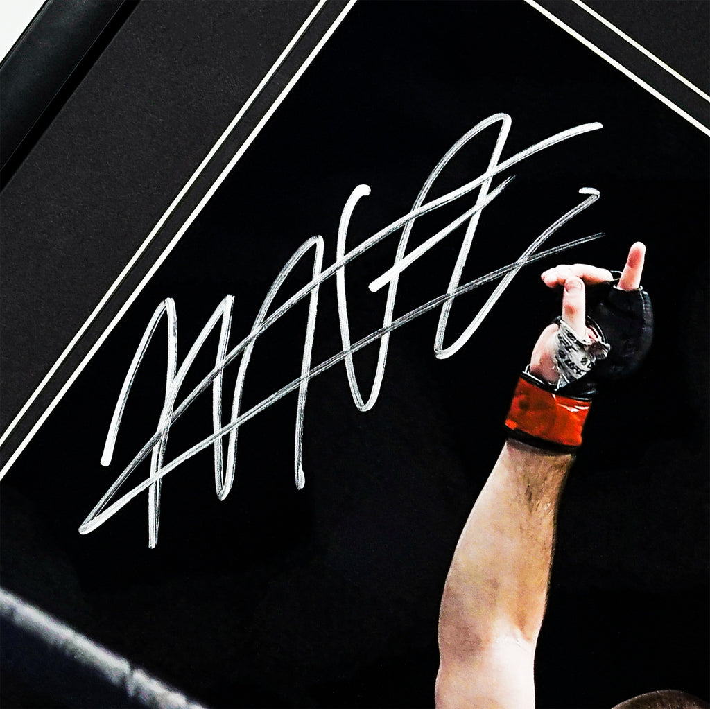 The photograph has been hand-signed by Khabib Nurmagomedov and is professionally presented in a high-quality black frame with a sleek double mount, making it ideal for display in any sports collection, gym, office, or man cave.