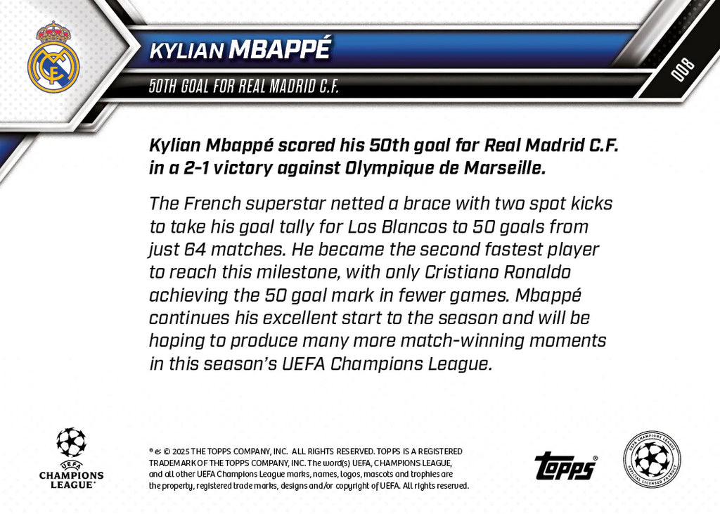 This Topps NOW® Orange parallel, limited to just 25 copies, commemorates Kylian Mbappé’s milestone 50th goal for Real Madrid C.F., marking a major achievement early in his career with the club. Featuring strong visual impact and a striking Orange finish, this 1/25 card is a standout collectible for football fans and collectors looking to secure a low-numbered piece celebrating one of the game’s most electrifying talents reaching a landmark moment in Madrid colours.