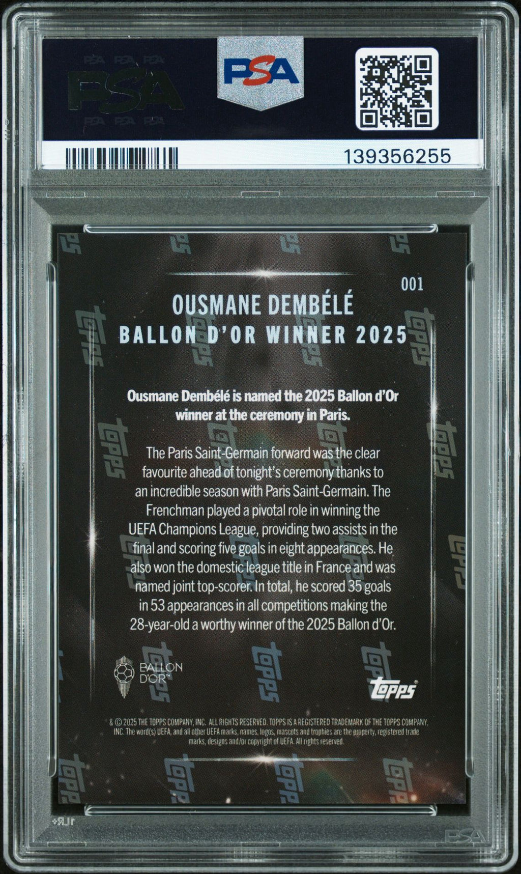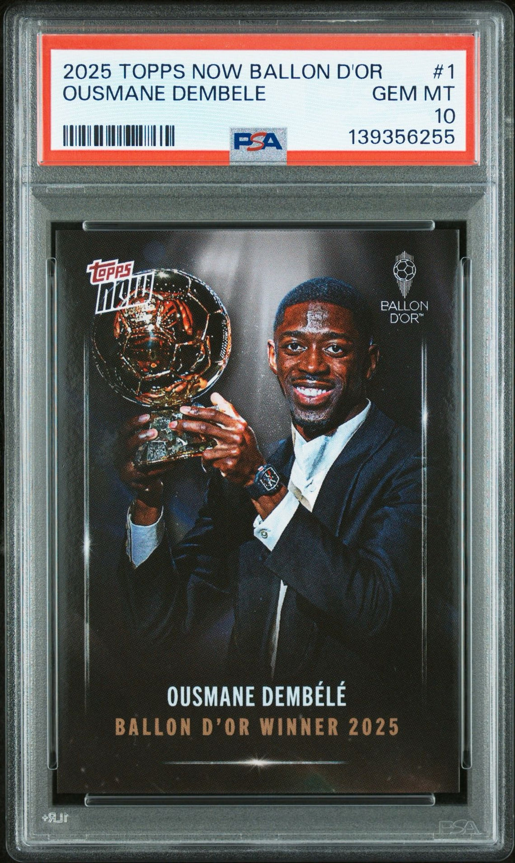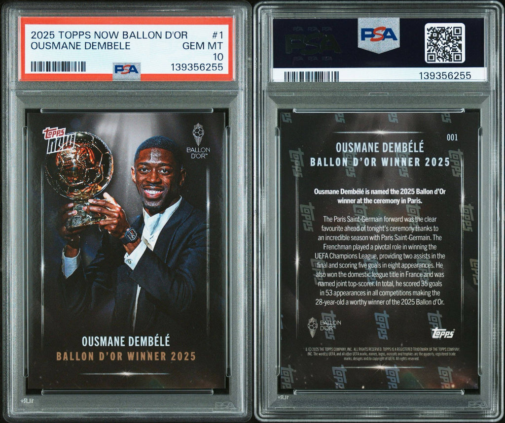 This Topps NOW® card commemorates Ousmane Dembélé’s crowning achievement as the 2025 Ballon d’Or winner, marking the pinnacle of an exceptional season at the highest level of football. With strong visual appeal and premium finish, this card is a standout collectible celebrating Dembélé’s rise to the very top of the game and his place among football’s elite.