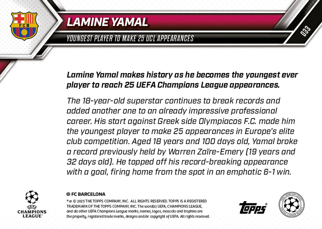 This Topps NOW® Orange parallel, serial numbered 01/25, celebrates Lamine Yamal becoming the youngest player in history to reach 25 UEFA Champions League appearances, marking a truly historic milestone in his rapidly rising career with FC Barcelona. Featuring striking visual appeal and a vibrant Orange finish, this low-numbered 01/25 card is a standout collectible for collectors seeking a premium, limited piece commemorating one of the most remarkable records ever achieved on Europe’s biggest stage.