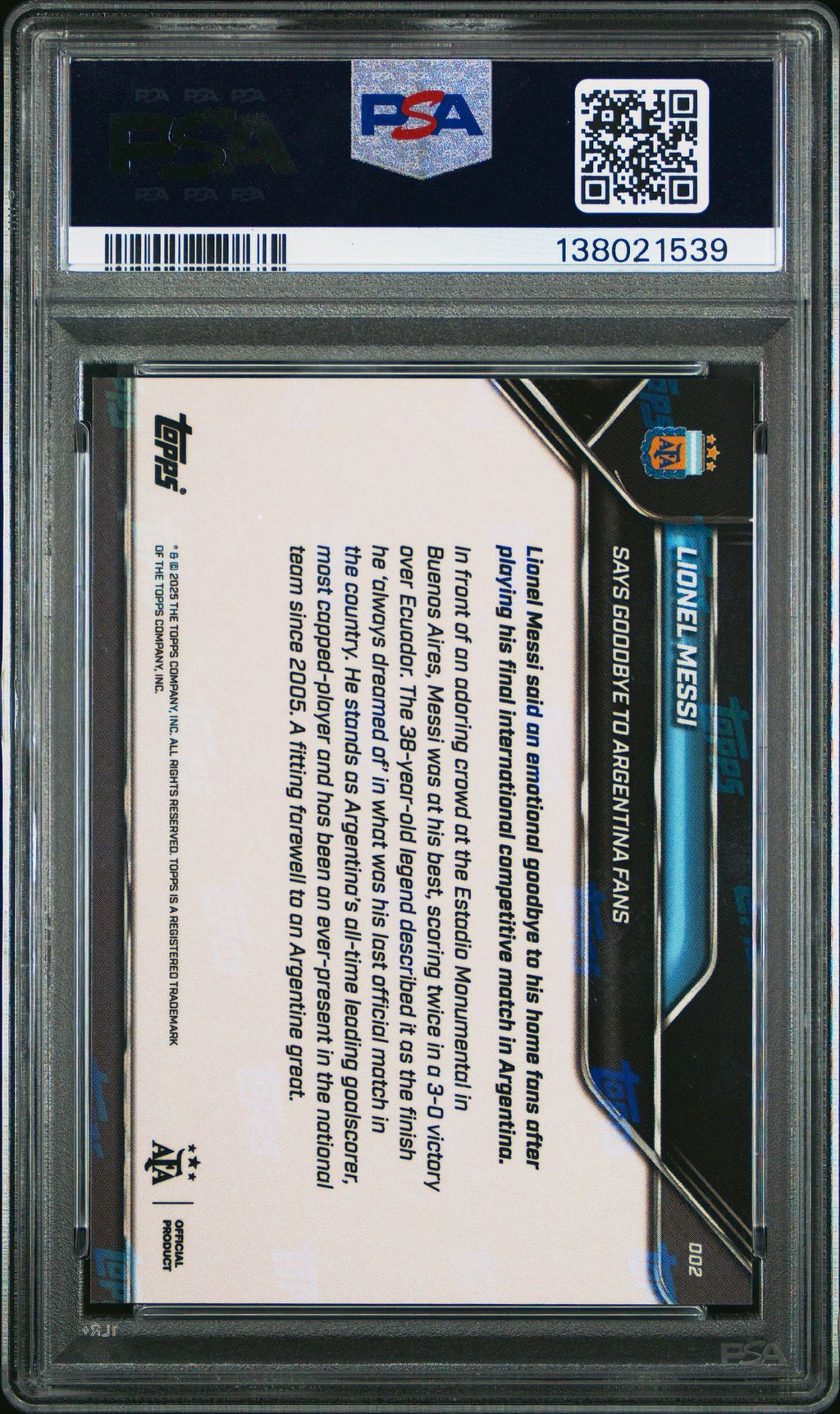 , celebrating another iconic moment from the career of one of football’s greatest ever players. Graded in gem mint condition, the card features pristine surfaces, sharp corners, and flawless centering. A premium collectible that honours Messi’s enduring legacy on the international stage with Argentina.
